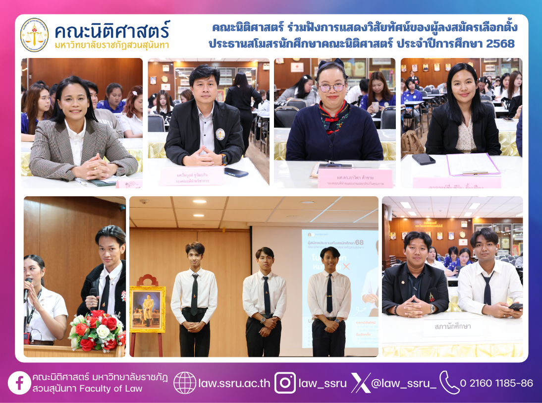 On 16 February 2026, Assistant Professor Dr. Kamonwan Yuwattana, Dean of the Faculty of Law, together with Assistant Professor Tattanun Konglamthan, Associate Dean for Student Affairs; Assistant Professor Paiboon Chuwattanakit, Associate Dean for Academic Affairs; Assistant Professor Dr. Pawita Khakhai, Associate Dean for Planning and Quality Assurance; and Mr. Chuenchiwin Yimfueang, Associate Dean for Research and Academic Services, as well as faculty members, staff, and students of the Faculty of Law, attended the Vision Presentation of the candidates running for President of the Faculty of Law Student Union for the Academic Year 2025. The three candidates were as follows: