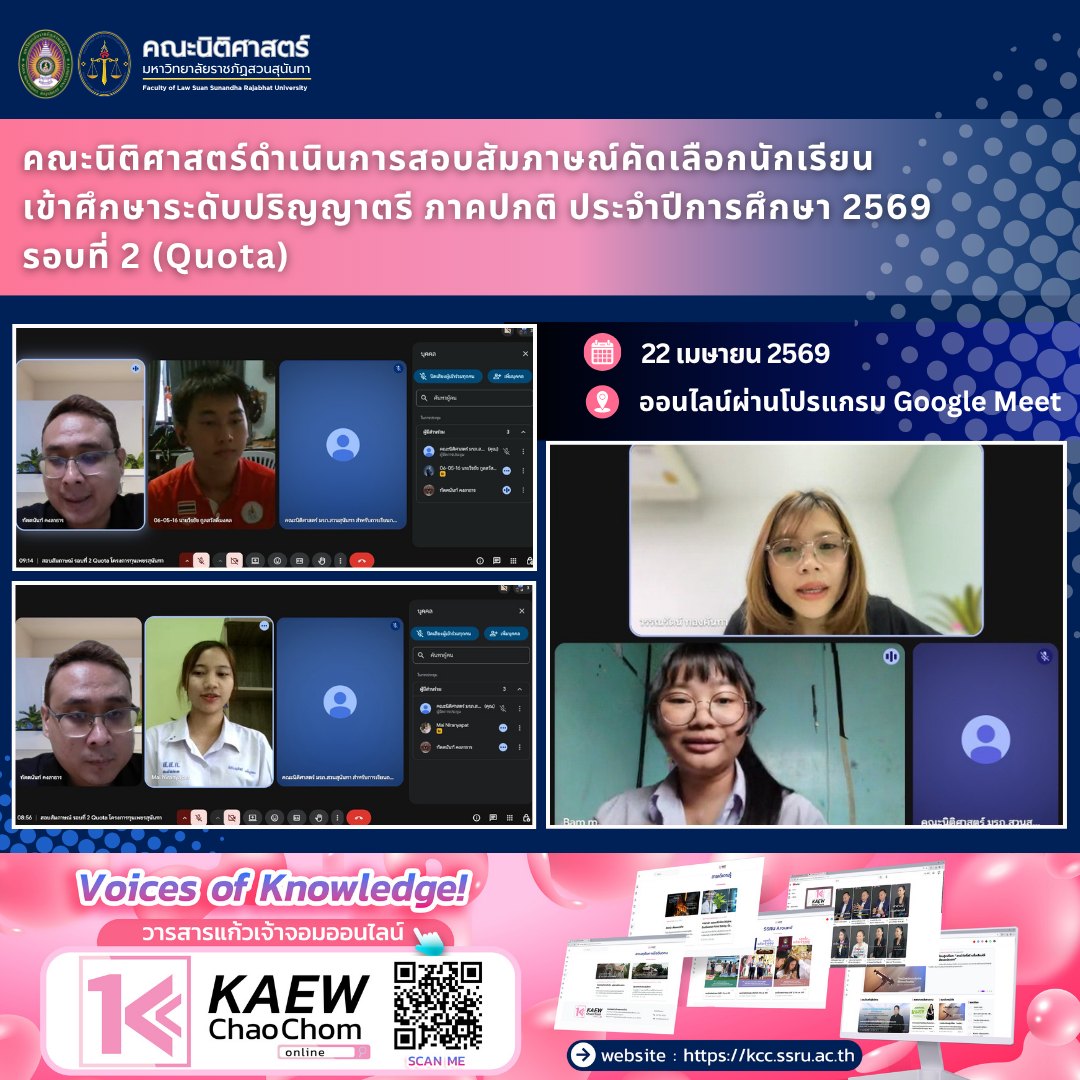Faculty of Law Conducts Interview Selection for Undergraduate Admissions (Regular Program), Academic Year 2026 – Round 2 (Quota) On 22 April 2026, the Faculty of Law, Suan Sunandha Rajabhat University, conducted interviews for students applying for admission to the undergraduate level (Regular Program) for the Academic Year 2026, Round 2 (Quota). The interviews were conducted online via Google Meet. On this occasion, Assistant Professor Tattanun Konglamthan, Deputy Dean for Student Affairs, together with Ms. Wannarat Thongkhanta, Lecturer of the Faculty of Law, participated in the interview process. |