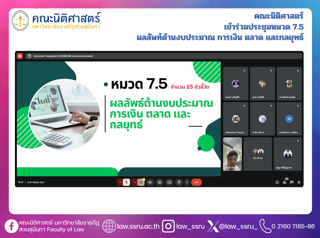 วันที่ 4 เมษายน 2568 ผู้ช่วยศาสตราจารย์ ดร.กมลวรรณ อยู่วัฒนะ คณบดีคณะนิติศาสตร์ พร้อมด้วยผู้ช่วยศาสตราจารย์ ดร.ภาวิตา ค้าขาย รองคณบดีฝ่ายแผนงานและประกันคุณภาพ ผู้ช่วยศาสตราจารย์ไพบูลย์ ชูวัฒนกิจ รองคณบดีฝ่ายวิชาการ นางสาวชุลีกร บุญถนอม หัวหน้าสำนักงานคณะฯ และนางสาวณัฐชา ลี้ปัญญาพร หัวหน้าฝ่ายนโยบายแผนงานและประกันคุณภาพ เข้าร่วมประชุมหมวด 7.5 ผลลัพท์ด้านงบประมาณ การเงิน ตลาด และกลยุทธ์ โดยมี รองศาสตราจารย์ ดร.วิทยา เมฆขำ รองอธิการบดีฝ่ายแผนงานและประกันคุณภาพ มหาวิทยาลัยราชภัฏสวนสุนันทา เป็นประธานในการประชุมครั้งนี้ ทั้งนี้มีคณะผู้บริหารมหาวิทยาลัย คณะ และหน่วยงาน เข้าร่วมประชุม ผ่านระบบ Google Meet |