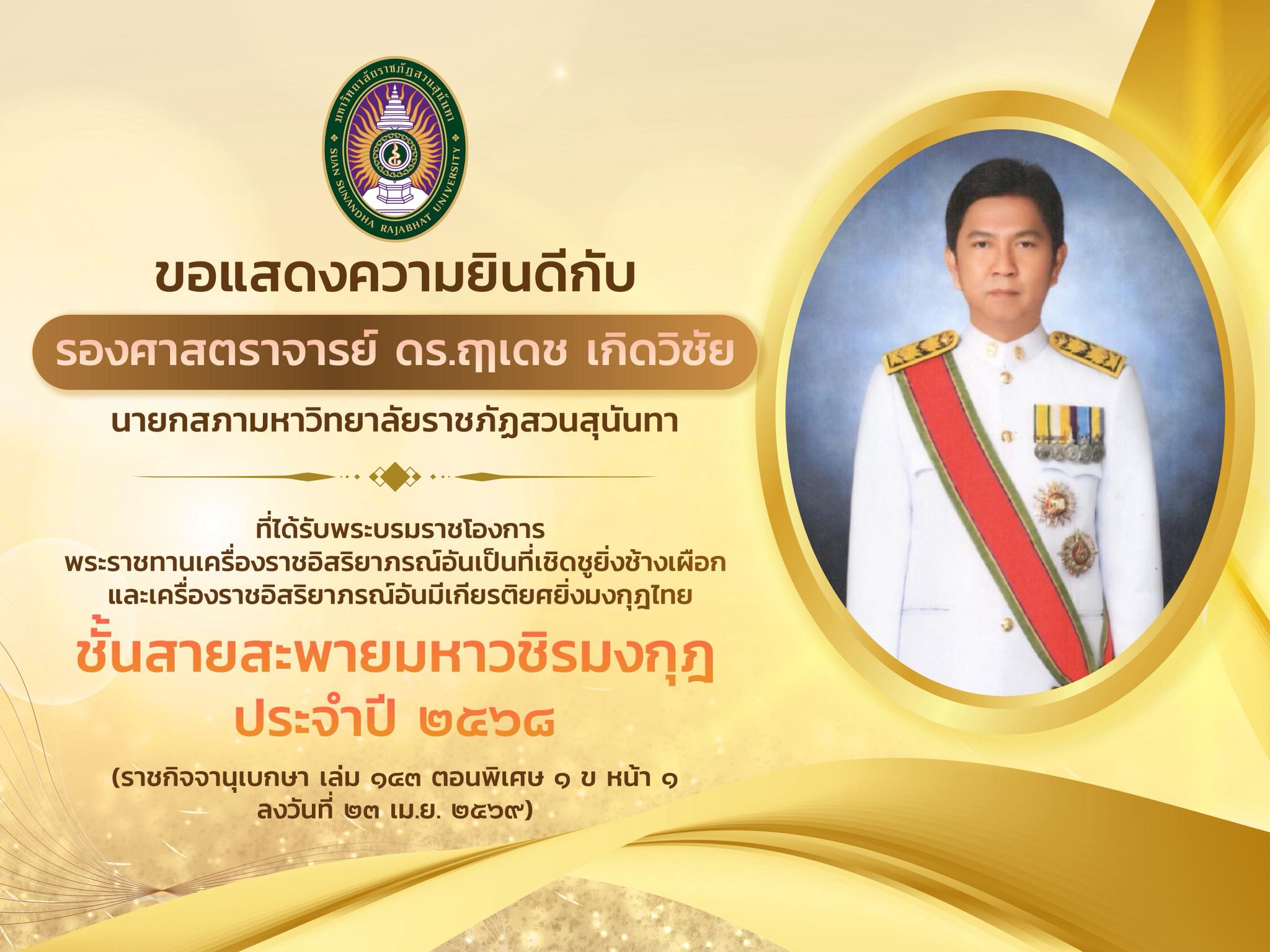 นายกสภามหาวิทยาลัยราชภัฏสวนสุนันทา ที่ได้รับพระบรมราชโองการ พระราชทานเครื่องราชอิสริยาภรณ์อันเป็นที่เชิดชูยิ่งช้างเผือก และเครื่องราชอิสริยาภรณ์อันมีเกียรติยศยิ่งมงกุฎไทย ชั้นสายสะพายมหาวชิรมงกุฎ ประจำปี 2568 (ราชกิจจานุเบกษา เล่ม 143 ตอนพิเศษ 1 ข หน้า 1 ลงวันที่ 23 เม.ย. 2569) |
