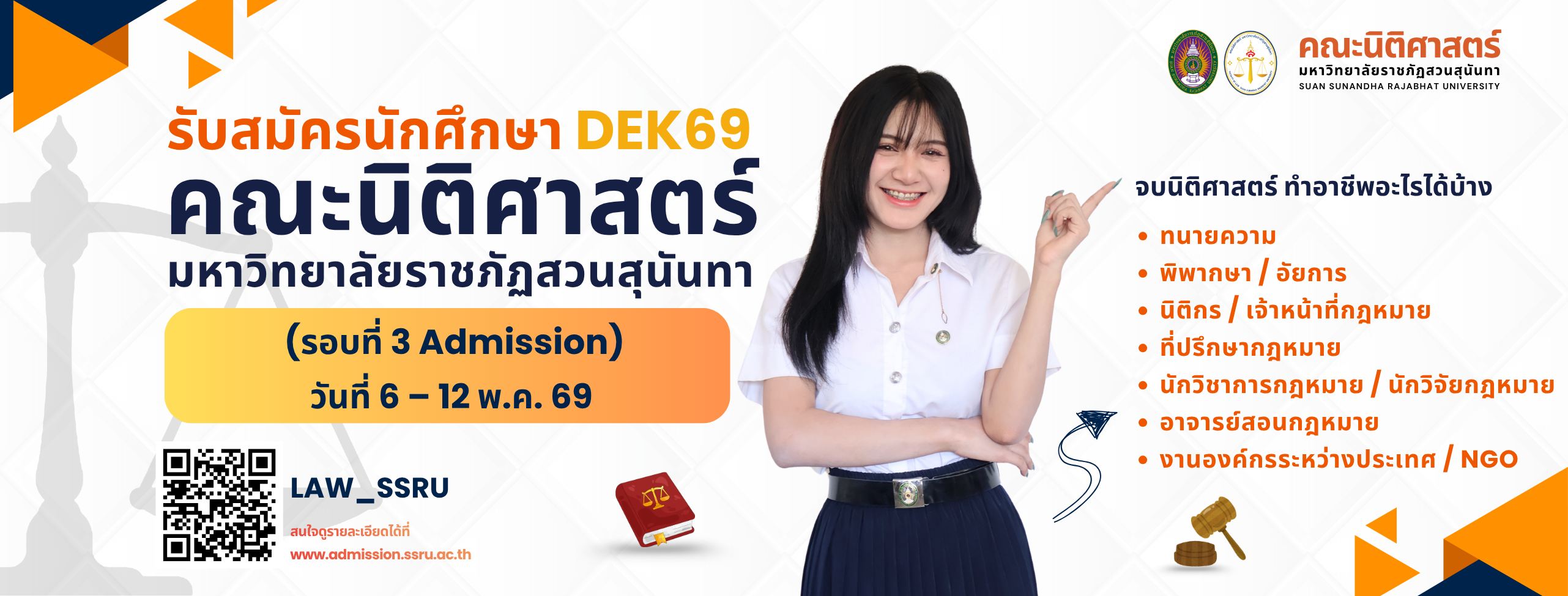 Admission) สมัครได้ตั้งแต่ 6 – 12 พฤษภาคม 2569 สมัครง่าย ๆ https://admission.ssru.ac.th/isqy01 ใครที่อยากเรียนกฎหมาย บอกเลยว่าที่นี่ไม่ได้มีแค่ท่องจำ แต่เน้นทั้ง ความรู้ + ทักษะจริง + โอกาสในสายอาชีพ แบบจัดเต็ม ถ้าใจอยากเป็น “สายกฎหมายตัวจริง” นี่คือจุดเริ่มต้นของคุณ อย่าปล่อยให้โอกาสหลุดมือ แล้วมาเจอกันที่ “นิติศาสตร์ สวนสุนันทา” |