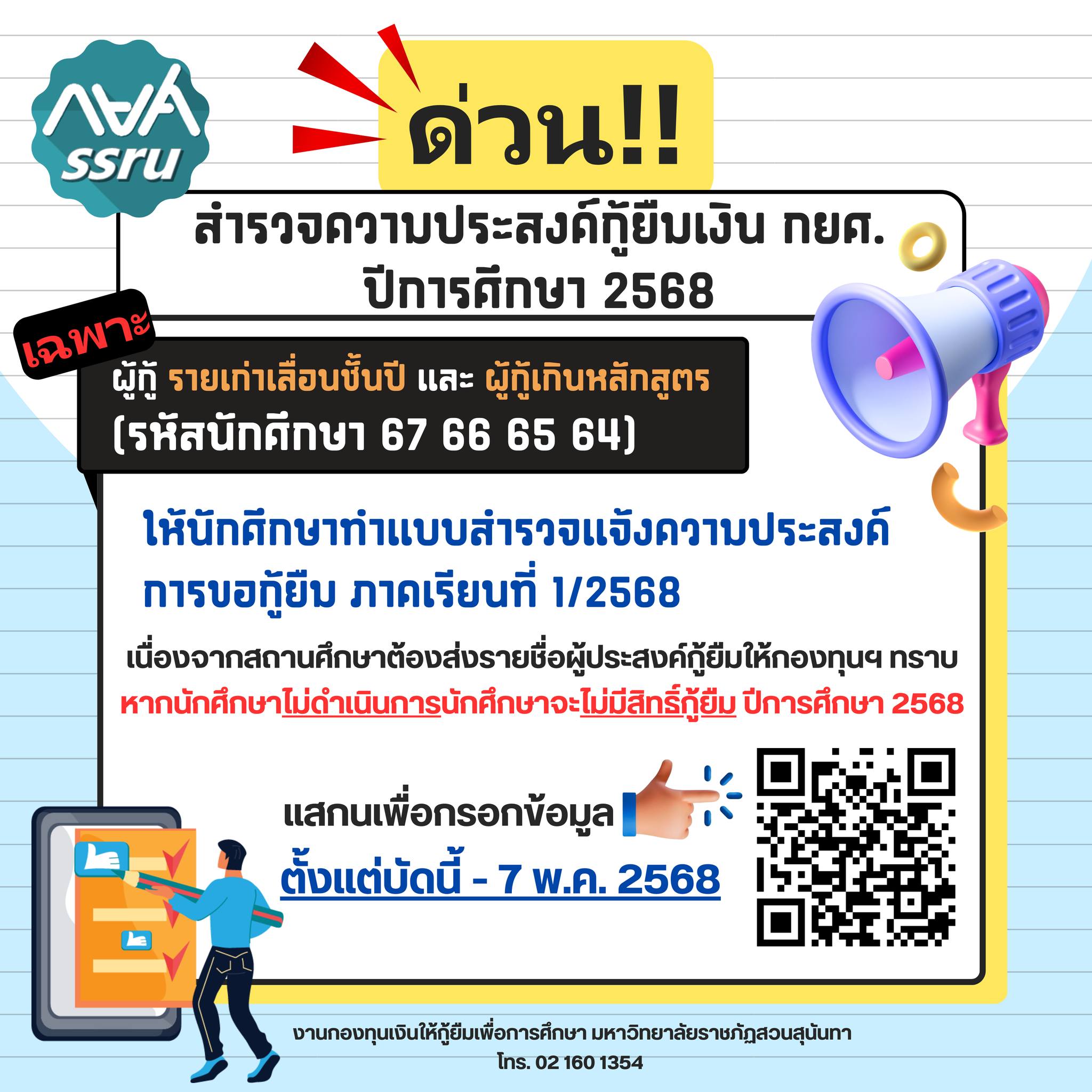 สำรวจแจ้งความประสงค์การขอกู้ยืม ภาคเรียนที่ 1/2568 เฉพาะผู้กู้ รายเก่าเลื่อนชั้นปี และ ผู้กู้เกินหลักสูตร (รหัสนักศึกษา 67 66 65 64) "เนื่องจากสถานศึกษาต้องส่งรายชื่อผู้ประสงค์กู้ยืมให้กองทุนฯ ทราบ หากนักศึกษาไม่ดำเนินการนักศึกษาจะไม่มีสิทธิ์กู้ยืม ปีการศึกษา 2568" ????กรอกได้ตั้งแต่บัดนี้ - 7 พ.ค. 2568 เท่านั้น คลิกลิงก์เพื่อกรอกข้อมูล : https://forms.gle/eSdh5RkyC7utSAyv8 |