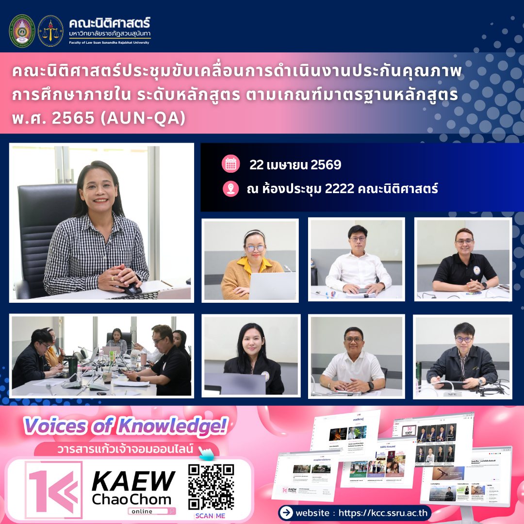 พ.ศ. 2565 (AUN-QA) วันที่ 22 เมษายน 2569 คณะนิติศาสตร์ มหาวิทยาลัยราชภัฏสวนสุนันทา นำโดย ผู้ช่วยศาสตราจารย์ ดร.กมลวรรณ อยู่วัฒนะ คณบดีคณะนิติศาสตร์ พร้อมด้วย ผู้ช่วยศาสตราจารย์ ดร.ภาวิตา ค้าขาย รองคณบดีฝ่ายแผนงานและประกันคุณภาพ ผู้ช่วยศาสตราจารย์ ไพบูลย์ ชูวัฒนกิจ รองคณบดีฝ่ายวิชาการ ผู้ช่วยศาสตราจารย์ทัตตนันท์ คงลำธาร รองคณบดีฝ่ายกิจการนักศึกษา อาจารย์ชื่นชีวิน ยิ้มเฟือง รองคณบดีฝ่ายวิจัยและบริการวิชาการ นายอำนาจ บุญถนอม หัวหน้าฝ่ายบริการการศึกษาและกิจการนักศึกษา และ นางสาวณัฐชา ลี้ปัญญาพร หัวหน้าฝ่ายนโยบายแผนงานและประกันคุณภาพ เข้าร่วมประชุมเพื่อขับเคลื่อนการดำเนินงานประกันคุณภาพการศึกษาภายใน ประจำปีการศึกษา 2568 ในระดับหลักสูตร ตามเกณฑ์มาตรฐานหลักสูตร พ.ศ. 2565 (AUN-QA) ณ ห้องประชุม 2222 คณะนิติศาสตร์ การประชุมดังกล่าวมีวัตถุประสงค์เพื่อกำหนดแนวทางการดำเนินงาน ติดตามผล และพัฒนาคุณภาพหลักสูตรให้เป็นไปตามเกณฑ์มาตรฐานที่กำหนด อันจะนำไปสู่การยกระดับคุณภาพการจัดการศึกษาให้มีประสิทธิภาพและสอดคล้องกับมาตรฐานสากล “การพัฒนาคุณภาพอย่างต่อเนื่อง คือหัวใจสำคัญของการสร้างมาตรฐานการศึกษาสู่ระดับสากล” |