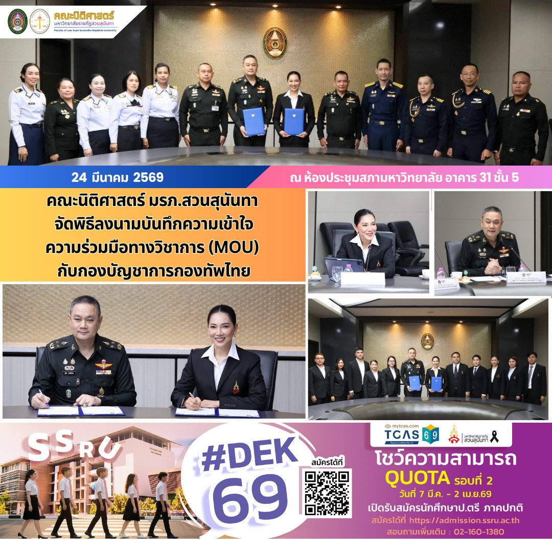 > คณะนิติศาสตร์ มรภ.สวนสุนันทา จัดพิธีลงนามบันทึกความเข้าใจความร่วมมือทางวิชาการกับกองบัญชาการกองทัพไทย